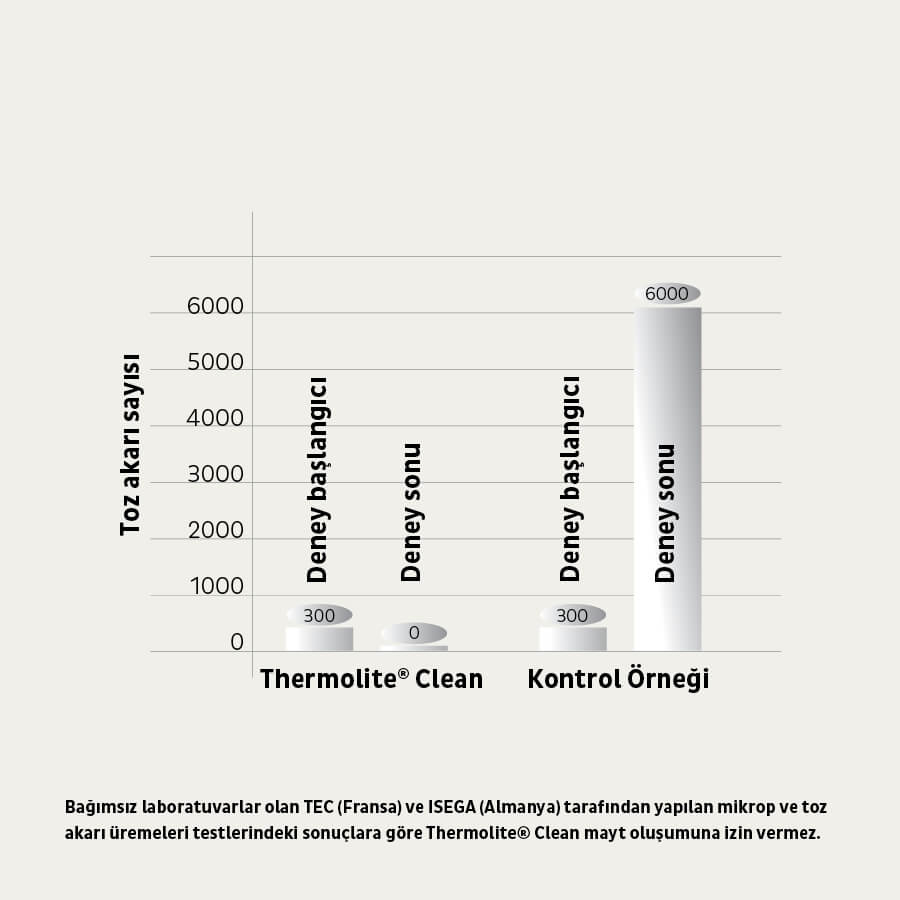 %100Thermolite® CleanMikroelyaf KapitoneThermolite® Clean yastık ve yorgan, üzerinde mantar üremesine ve dolayısıyla toz akarı yaşamasına izin vermez. Kulak-burun-boğaz hastalıklarına neden olan bazı bakterilerin üremesini de engeller.