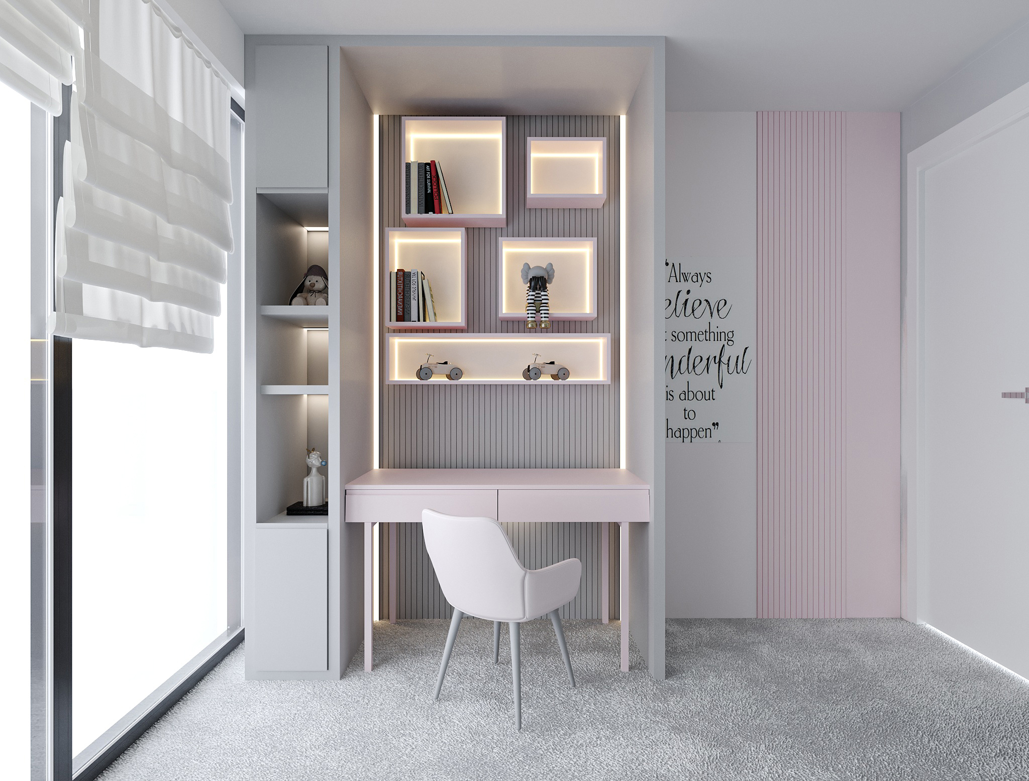 Üst ünitede yer alan farklı ölçülerdeki 5 adet LED'li raflar, çocuk odası dekorasyonunu tamamlayacak şekilde istediğiniz renkte üretilir. 20 cm derinliğe sahip bu rafların arkasındaki lambri lake kaplama da isteğe göre renk seçenekleriyle sunulmaktadır. Sol tarafta tavana kadar uzanan dikey ünite ise üst ve alt kısmı kapaklı, orta kısmı ise LED'li açık raflı olarak tasarlanmıştır.