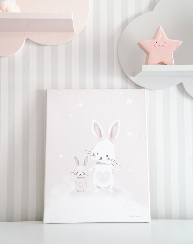 Çocuk odalarına sıcak ve sevgi dolu bir atmosfer katmak için özel olarak tasarlanan çocuk odası tablo, yüksek kaliteli pamuk bazlı canvas tablo üzerine özenle basılmaktadır. Anne ve bebek tavşan figürüyle huzurlu bir tasarıma sahip olan bu bebek odası tablo, bebeklerin odasına sevimli bir dokunuş kazandırır.