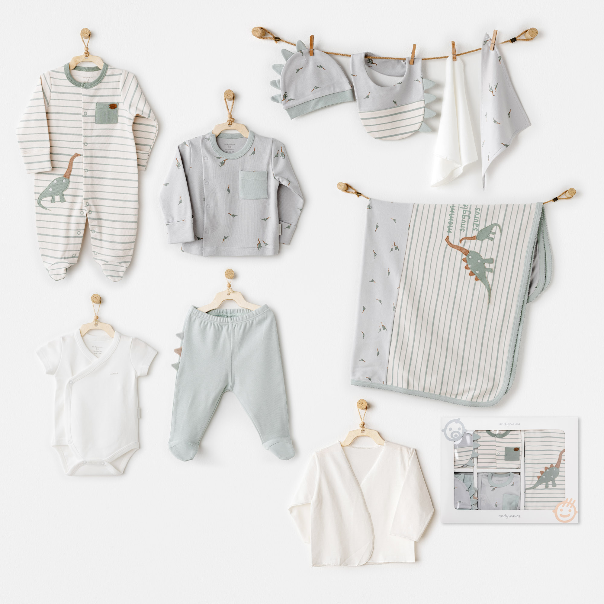 Minik mucizenizin dünyaya merhaba dediği özel anlar için tasarlanan yeşil dino tasarımlı 10 parçalık hastane çıkış seti, bebeğinizin tüm ihtiyaçlarını karşılayacak şekilde özenle hazırlanmıştır. Yumuşacık dokusu ve sevimli dinozor desenleri ile hem konforlu hem de şık bir kullanım sunar.