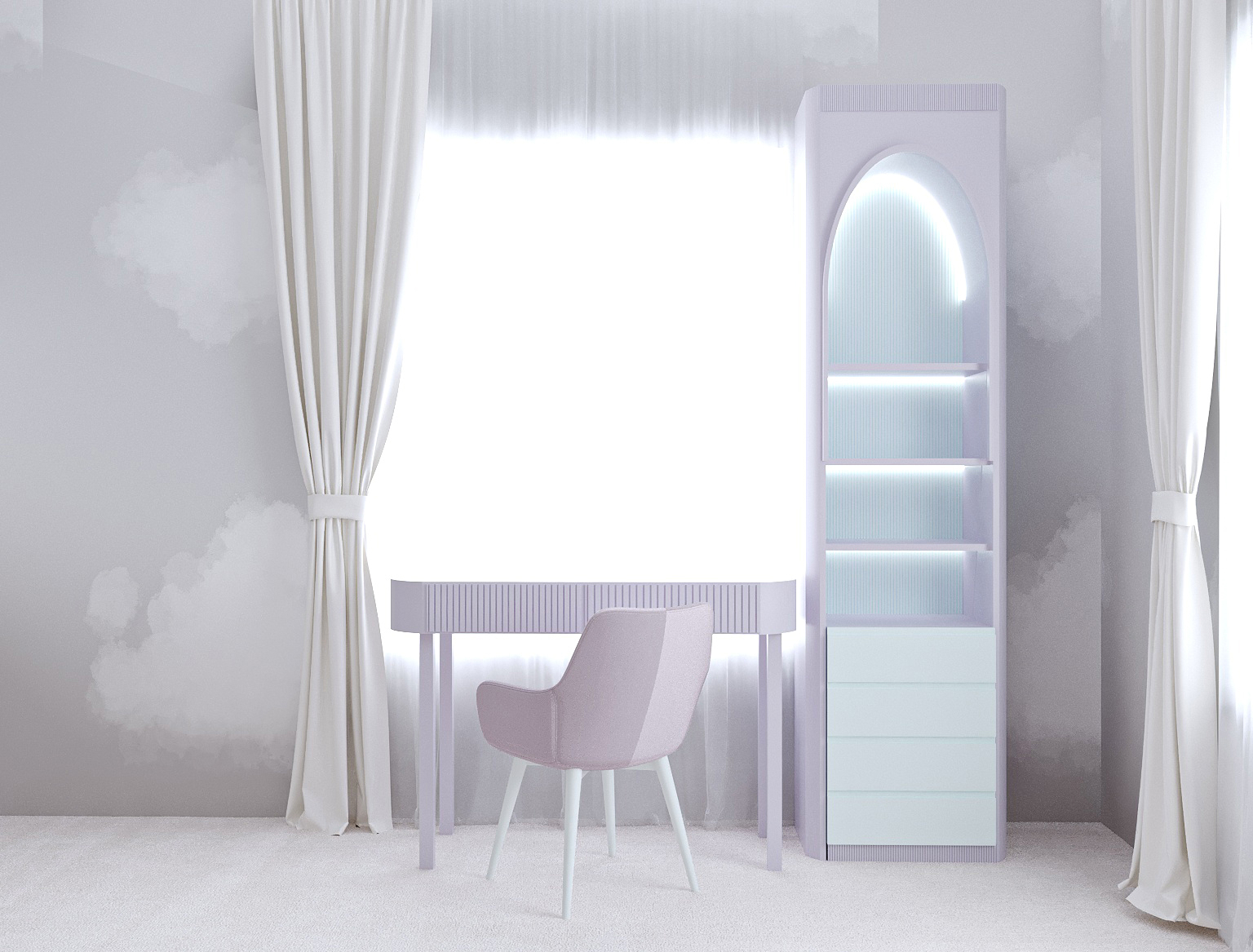 Çocuk çalışma masası setinin sağında (tercihe göre solda da kullanılabilir) yer alan dikey ünite, alt kısmında kapaklı dolap ve üst kısmında ledli açık raf tasarımıyla dikkat çeker. Bu ünitenin derinliği 50 cm, eni 50 cm ve yüksekliği 210 cm olup, daha yüksek ölçüler için özel sipariş verilebilmektedir.