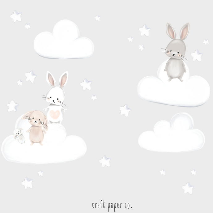 Set içinde 7 sevimli tavşan, 20 yıldız, 4 bulut ve yıldız şeklinde bir balon bulunuyor. Tüm parçalar ayrı olarak tasarlandığı için ister bizim örneğimizdeki gibi uygulayabilir, ister kendi hayal gücünüzle farklı yerleştirmeler yapabilirsiniz.