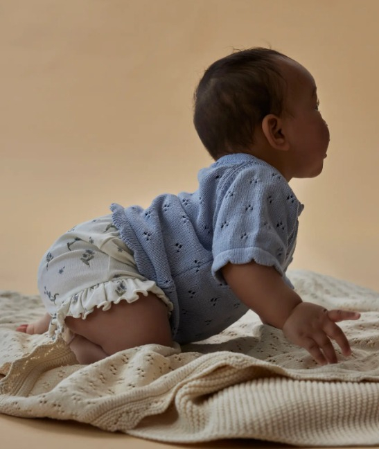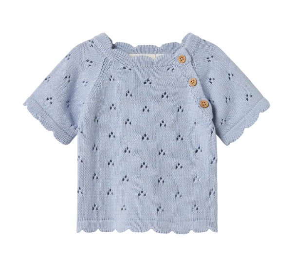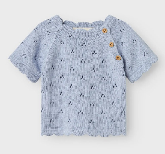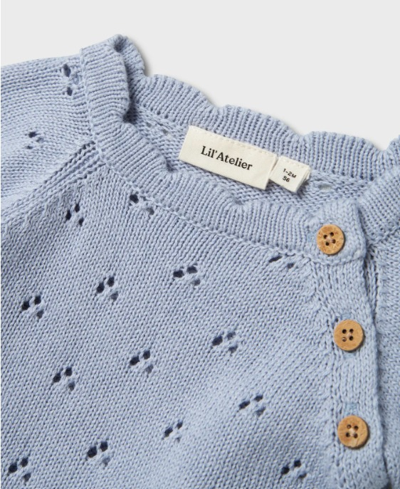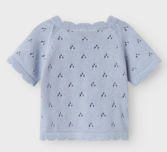 Yumuşacık dokusu ve zarif tasarımıyla minik bedenleri sıcacık saran bu mavi örgü kazak, pamuklu yapısıyla hem cildi nazikçe sarar hem de gün boyu konfor sağlar. İnce ajur desenleri ve yan omuzda yer alan ahşap düğme detayları, klasik örgü modeline modern ve şık bir dokunuş katıyor. Dalga formlu etek ve kol kenarlarıyla hareket kazanan bu sevimli üst, hem günlük kullanım hem de özel gün kombinleri için ideal.