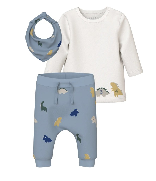 Minik dinozorlardan ilham alan bu 3 parçalı bebek takımı; bir uzun kollu tişört, pamuklu pantolon ve uyumlu önlükten oluşuyor. Mavi, beyaz ve pastel tonlardaki dinozor desenleriyle dikkat çeken takım, bebeklere şirin bir görünüm kazandırırken onların rahat hareket etmelerine olanak tanır. Tişörtün etek kısmındaki dinozor baskıları eğlenceli detaylar sunarken, pantolon ve önlüğün desenleriyle tam uyum içinde olması kombin kolaylığı sağlar. %100 pamuklu yapısıyla cilt dostudur, nefes alabilen kumaşı sayesinde dört mevsim rahatlıkla kullanılabilir. Günlük kullanım ve hediye alternatifi olarak da oldukça idealdir.