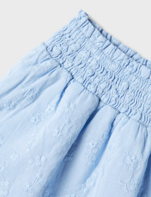 Yumuşacık dokusu ve zarif çiçek işlemeleriyle bu mavi çocuk eteği, küçük hanımlar için hem konforlu hem de stil sahibi bir seçenek sunar. Bel kısmındaki esnek lastik detayı sayesinde kolay giyilip çıkarılabilir ve gün boyu rahatlık sağlar.
