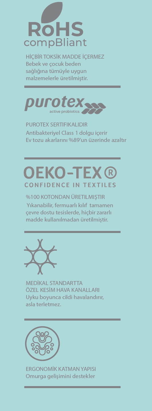 Doğal lateks hipoalerjenik bir üründür. Ev tozu, akar gibi zararlı olabilecek etkenler üzerinde barınamaz. Çocuğunuzun kesintisiz ve kaliteli bir uyku uyumasını kolaylaştırır.