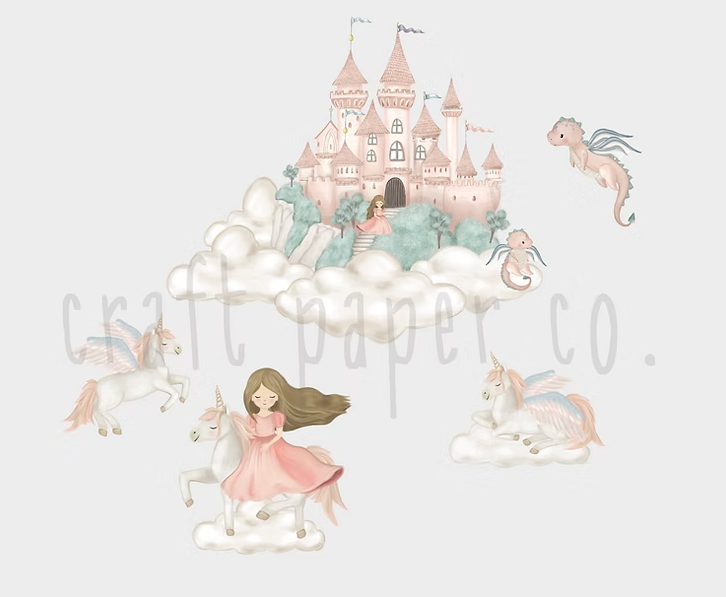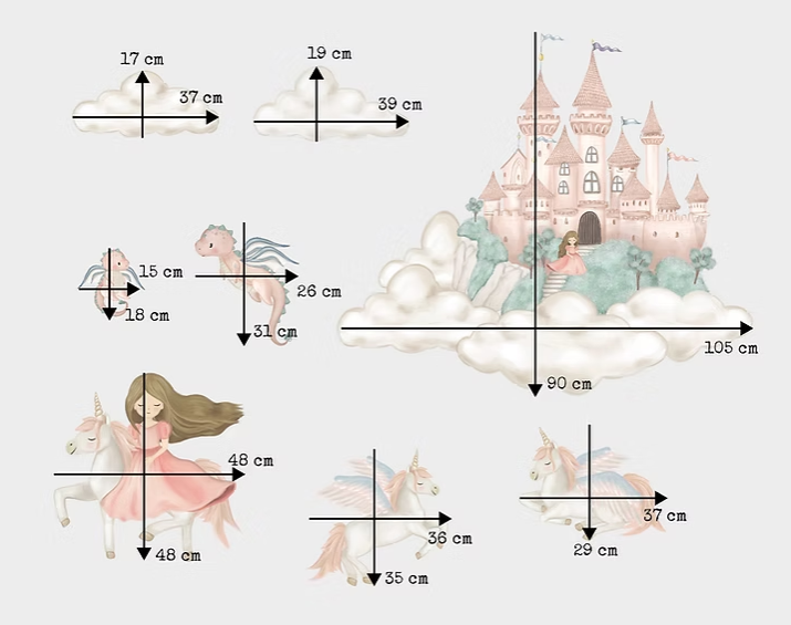 2 adet ejderha, 2 unicorn, 1 unicornlu prenses, 2 bulut ve bulutlar üstünde şato içeriyor. hepsi ayrı ayrı, siz istediğiniz tatlı düzende uygulayabilirsiniz.
