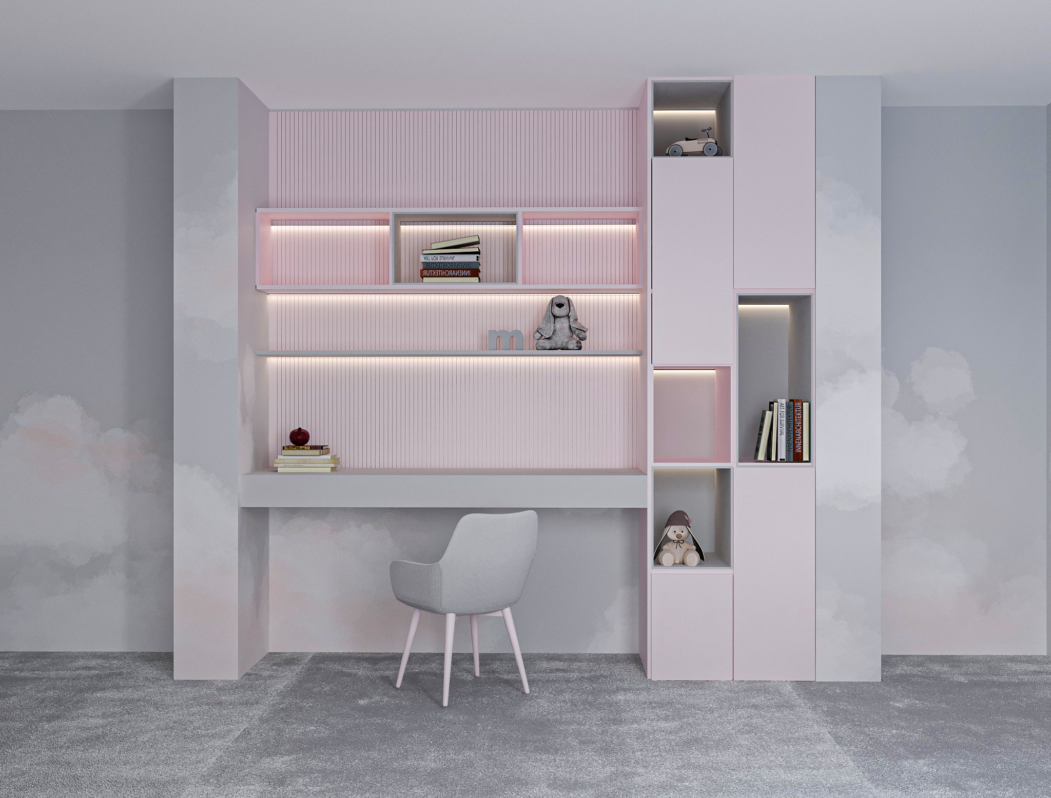 Üst ünite, 3 adet uzun ve led aydınlatmalı raf ile donatılmıştır. Rafların derinliği 20 cm olup, arkalarındaki lambri lake kaplama istediğiniz renkte üretilebilir. Sağdaki dikey ünite ise tamamen gömme tasarımıyla kullanışlı bir alan sunar. Bu ünite, alt ve üst kısmı kapaklı dolap, orta kısmı ise ledli açık raflı olarak tasarlanmıştır. Derinliği 50 cm, eni 80 cm ve yüksekliği 260 cm olan bu ünite, odanıza hem şıklık hem de düzen getirir. İsteğinize bağlı olarak ünite solda da üretilebilir.
