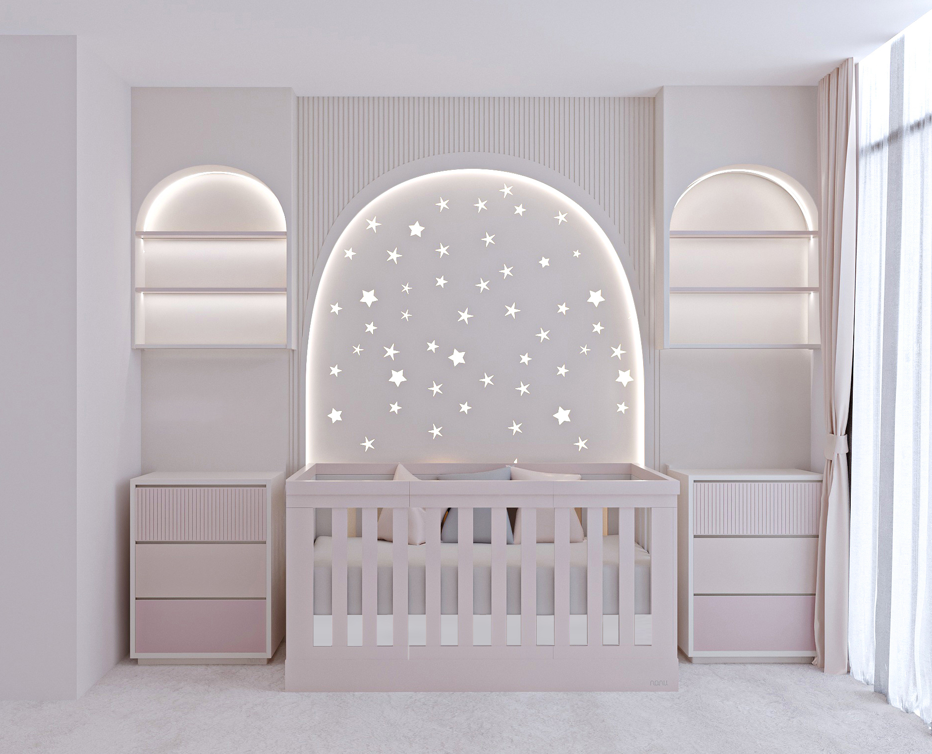 Nanu’nun sunduğu bu çocuk odası seti, duvarınıza özel tasarlanarak karyola, raf ve çekmeceli ünitelerle tam bir bütünlük oluşturur. Çocuğunuz büyüdüğünde sadece karyolayı değiştirerek odayı yeniden düzenleyebilirsiniz. Yıldızlı arka pano yerine duvar kağıdı veya kumaş kaplama gibi alternatiflerle kişiselleştirilebilir.